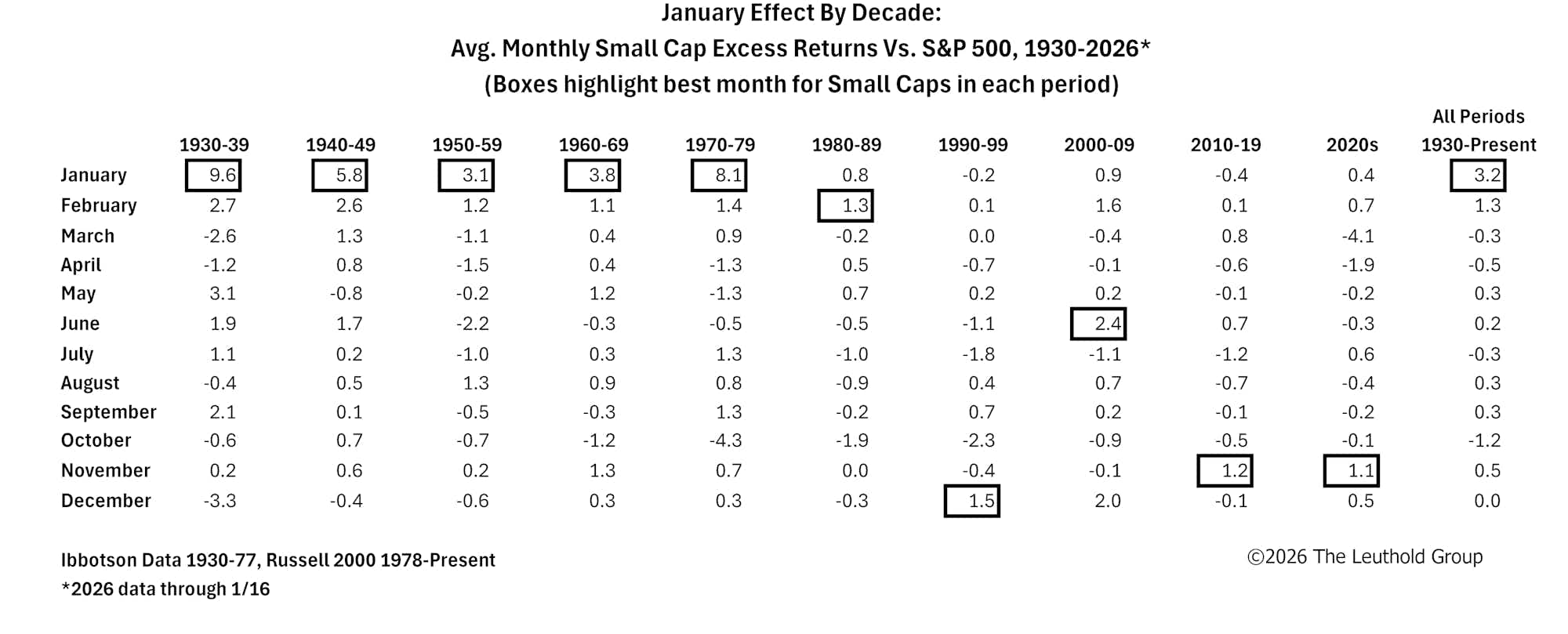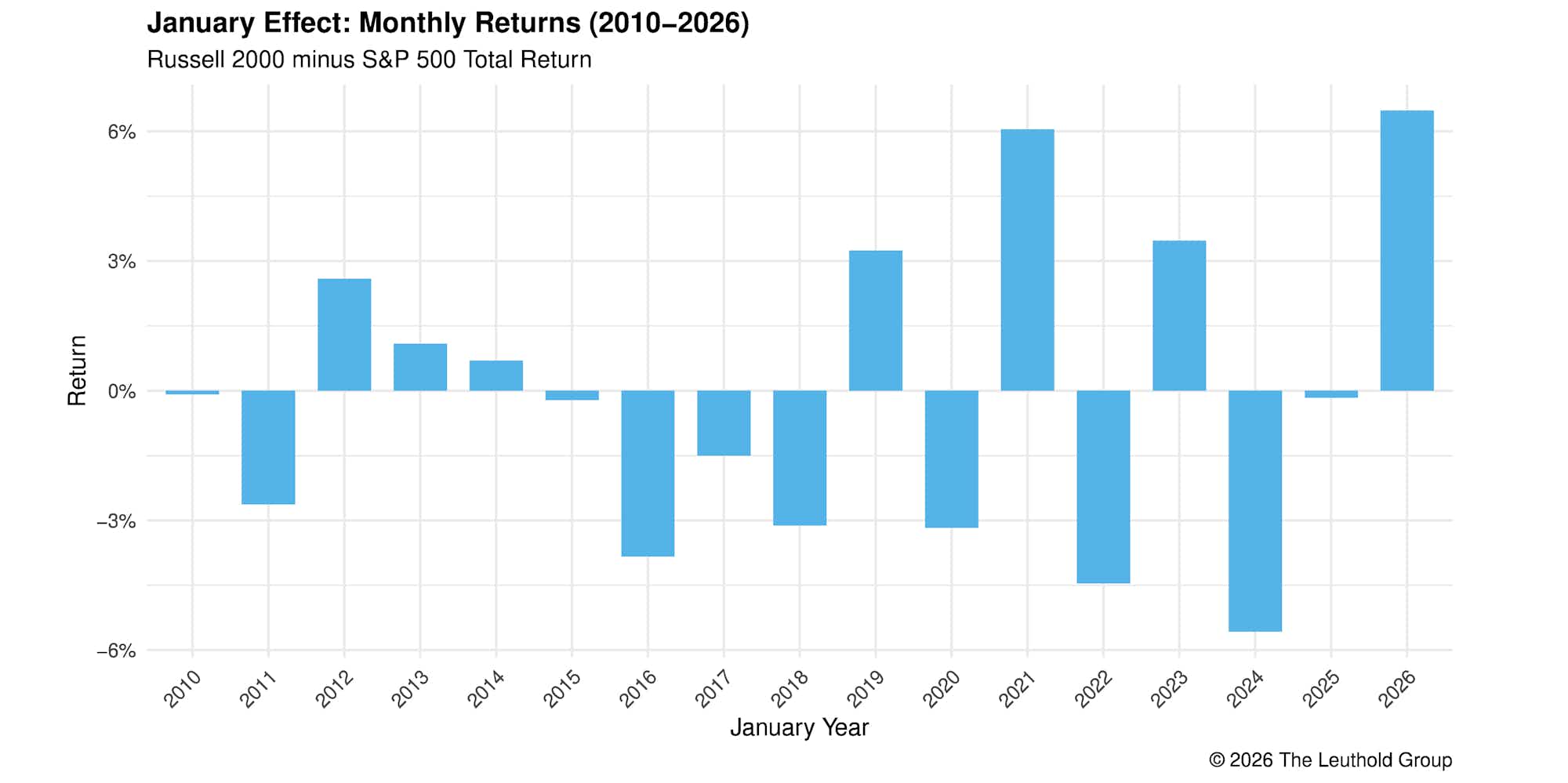 After missing a Santa Claus Rally (by a whisker) a few weeks ago, another calendar anomaly is firing on all cylinders. Through last Friday, the Russell 2000 had outperformed the S&P 500 in every trading session of 2026, leading to the largest “January Effect” (+6.5%) in recent history.