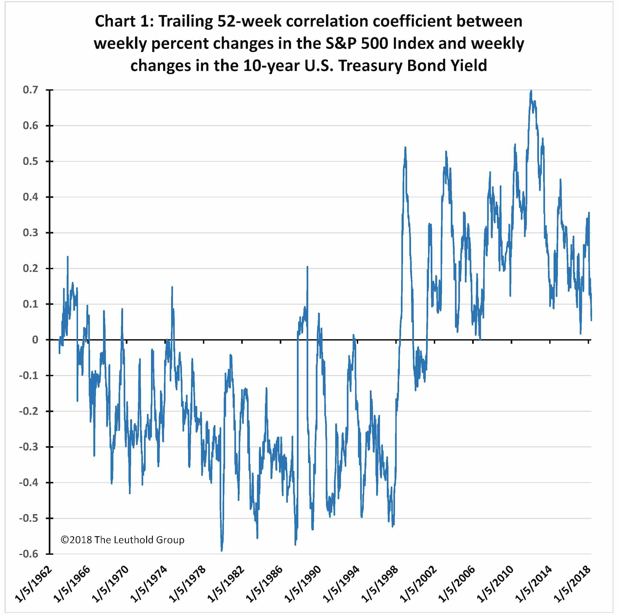 Chart 1 illustrates the trailing 52-week rolling correlation between percent changes in the stock market and yield changes in the bond market since 1962. This correlation has varied over time ranging between -0.60 to +0.70. Between the mid-1960s and the late-1990s, the correlation was mostly negative, but it has been above zero, for the most part, since 1998.