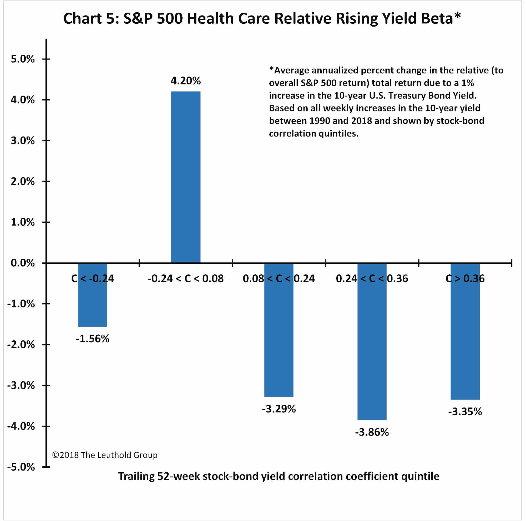 Among all sectors, Technology (Chart 4) is the most consistent performer when yields rise. It is only one of three sectors which exhibits a positive rising yield beta across all correlation quintiles. It responds the best to rising yields when the correlation is in its middle three quintiles. Technology stocks may therefore continue to do well this year even if investor mindset changes as the stock-bond yield correlation turns negative.