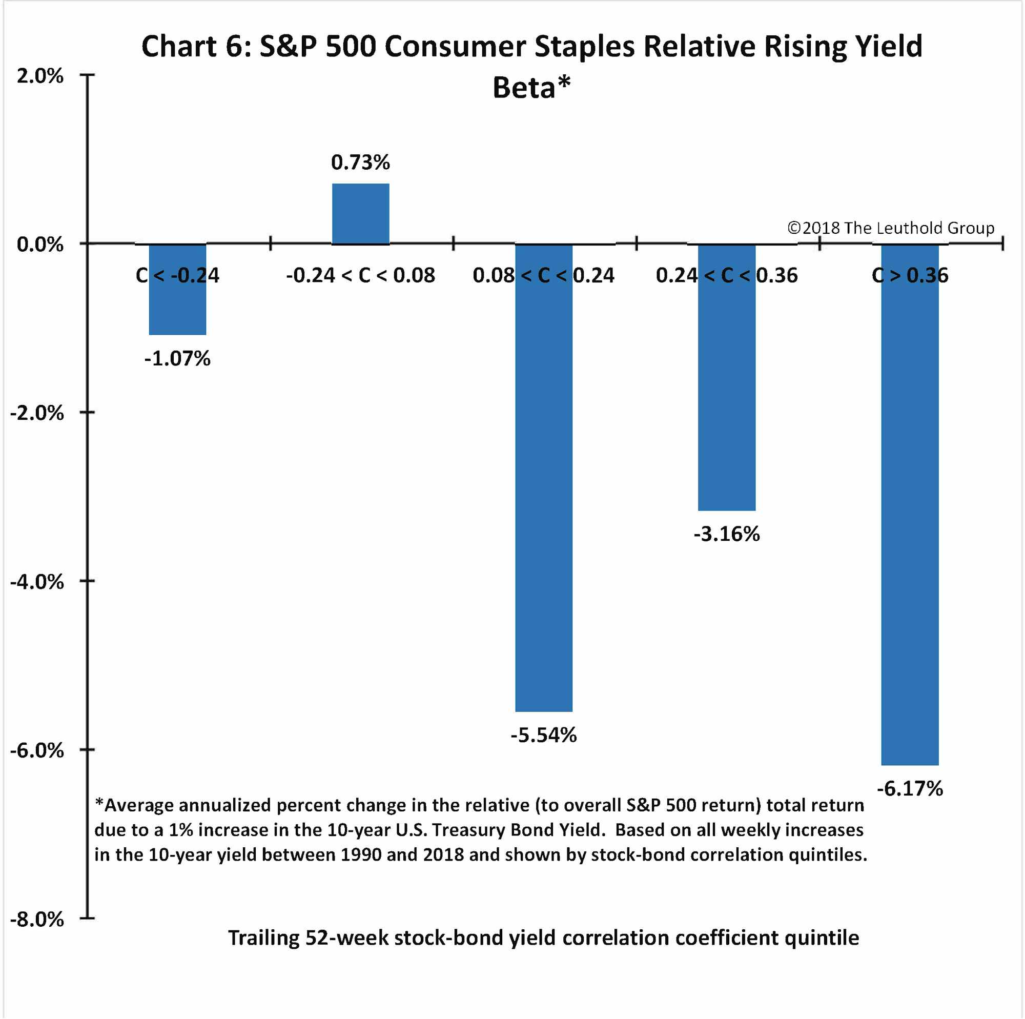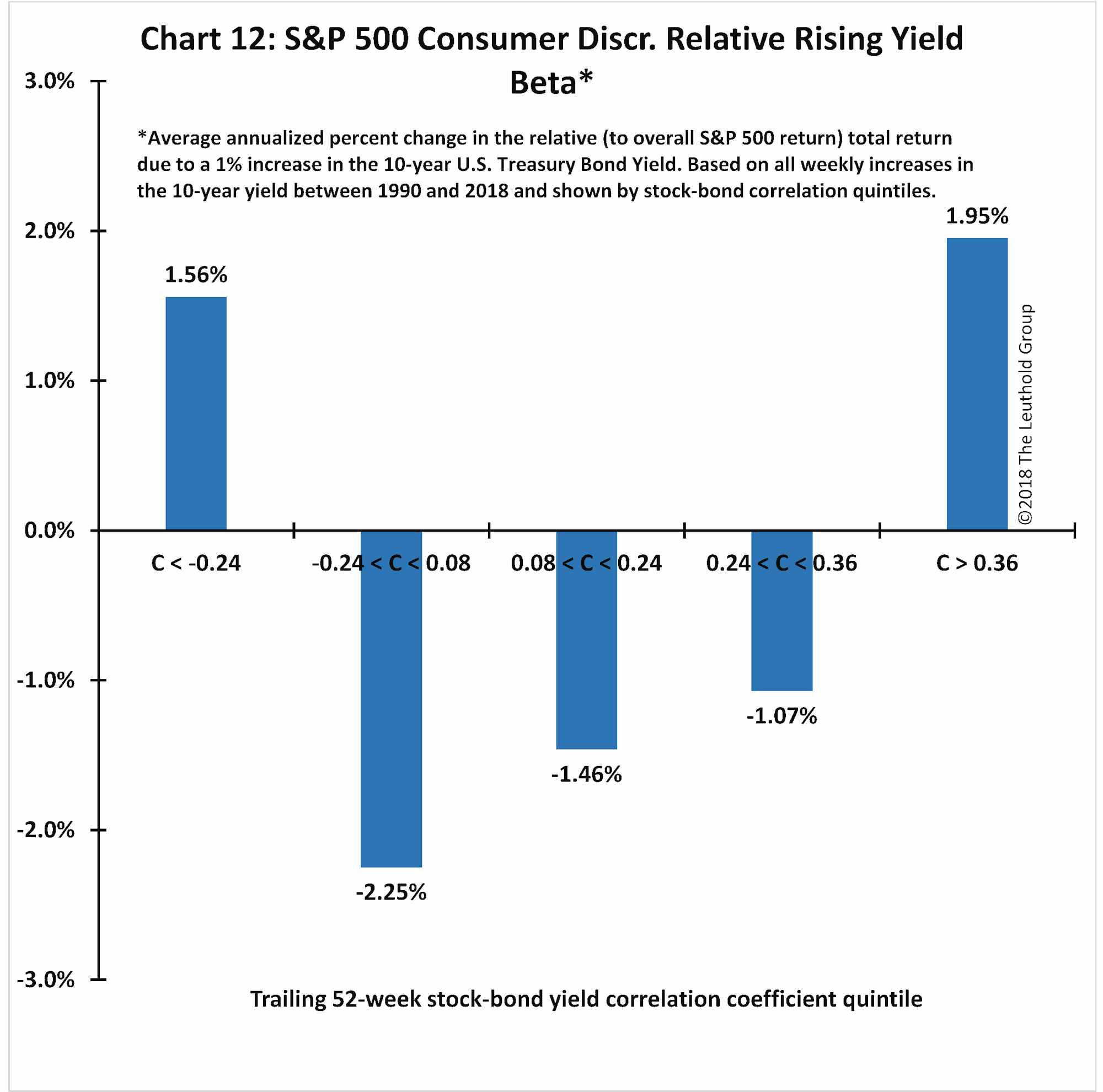 The Consumer Discretionary sector has a unique profile relative to rising yields. Its rising yield beta is strongly positive when the correlation is extremely high or low, but also strongly negative when the correlation is in its middle three quintiles. If growth or inflation concerns are severe, discretionary stocks have tended to do well in the face of rising yields. However, if growth and inflation concerns are not as intense (i.e., correlation in the middle three quintiles) discretionary stocks tend to underperform when yields rise.