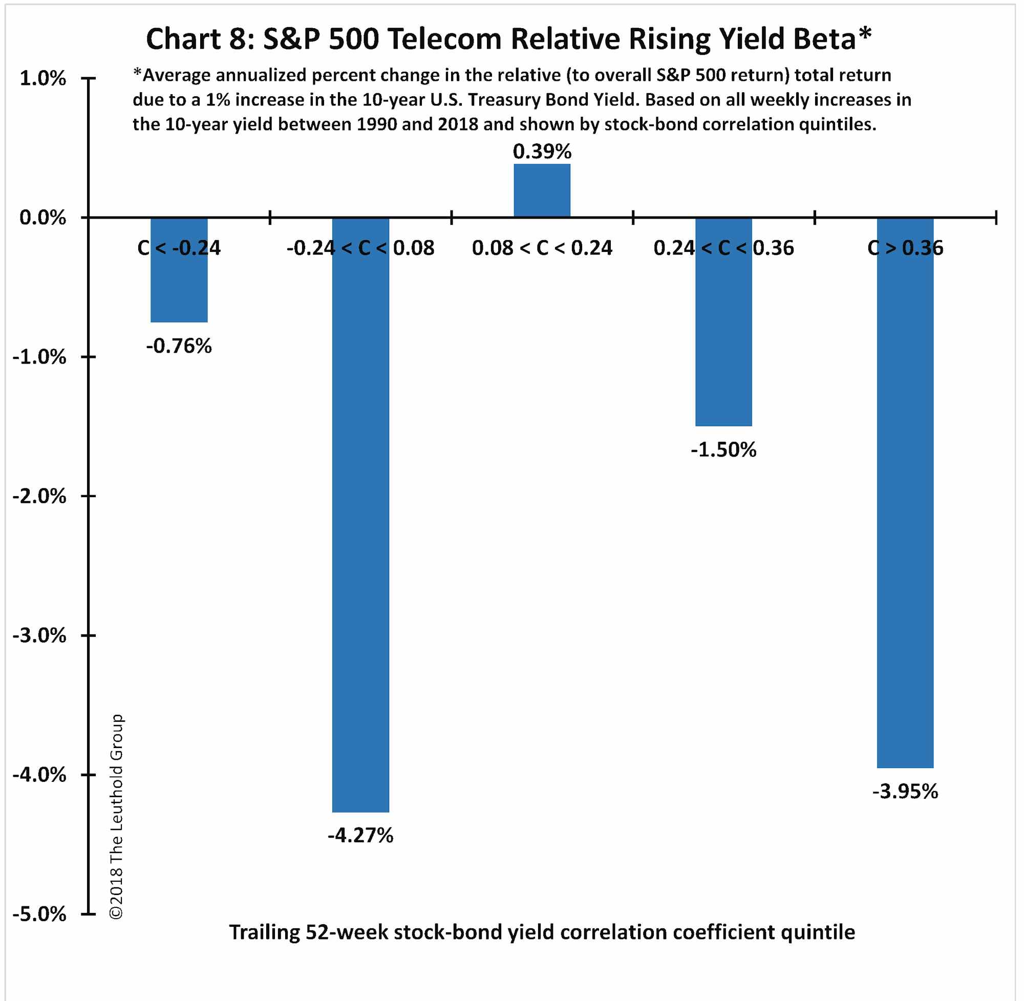 By contrast, and not surprisingly, the traditional defensive sectors (i.e., Health Care, Consumer Staples, Utilities, and Telecom) consistently suffer the most from rising yields. In all cases (Charts 5-8), their rising yield betas are negative in all but the second correlation quintile, and in general their betas tend to be more negative compared to other sectors. Moreover, defensive sector betas also tend to be much more negative in the top three correlation quintiles. That is, when investor mentality is more concerned about economic growth, rising yields are more damaging to defensive sectors than are rising yields when inflation is the primary concern. Because the correlation currently appears headed toward the lowest two quintiles, perhaps the damage to defensive stocks from additional yield increases will be far less than it was the last couple years?