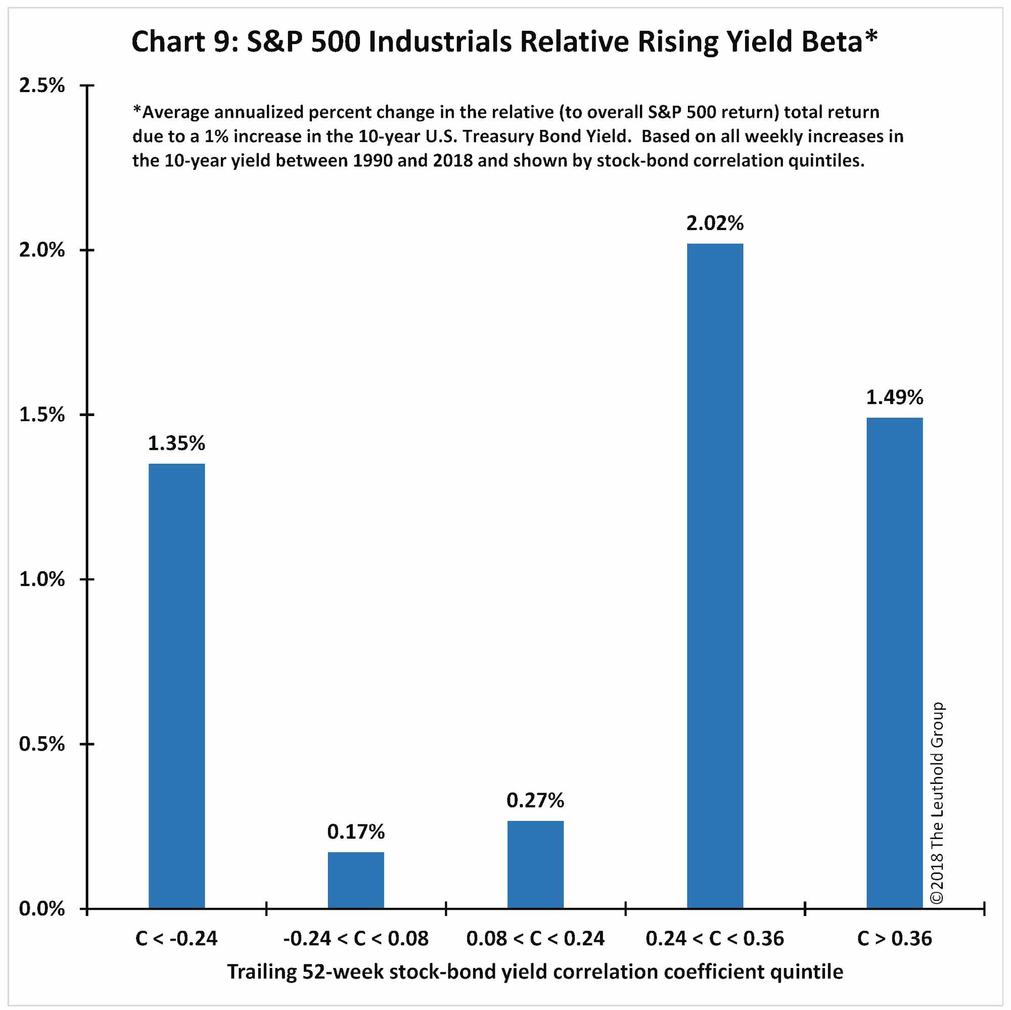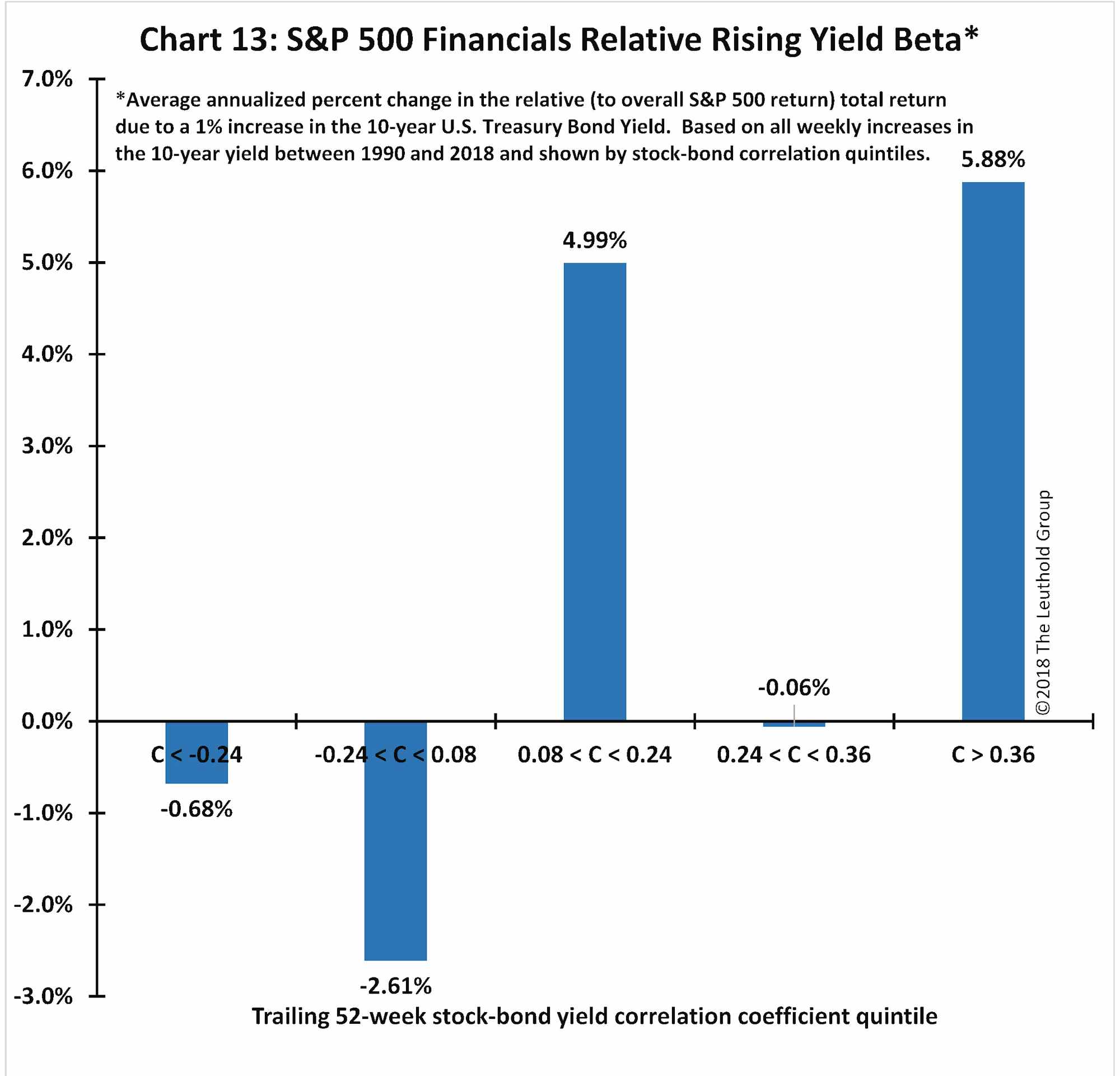 Finally, in general, the Financials sector is positively impacted by rising yields when economic growth is the primary concern (i.e., when the correlation is positive) and is negatively impacted when the correlation is in its lowest two quintiles. This suggests the recent leadership of financials, as yields have risen, may reverse if the correlation turns negative.
