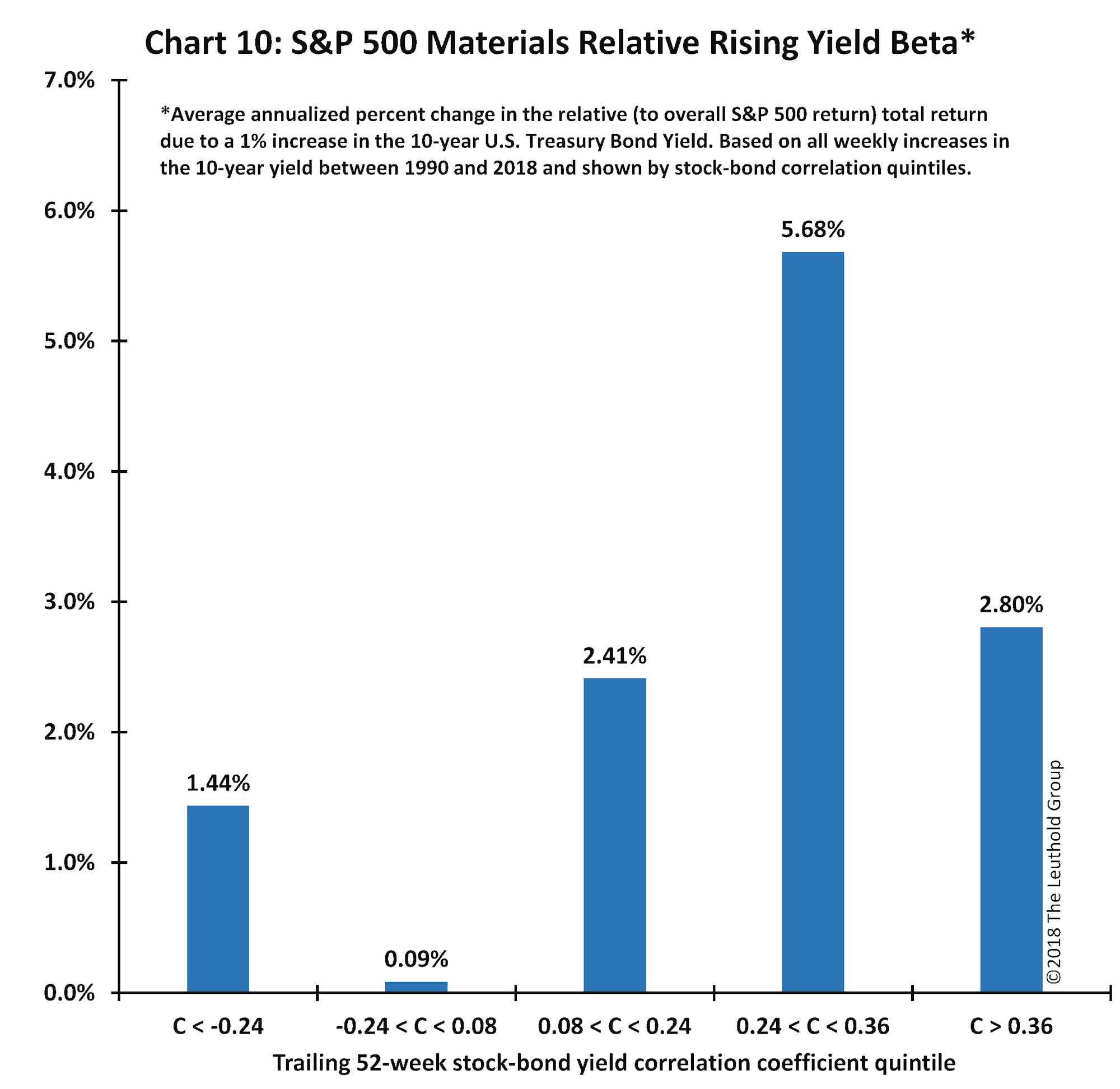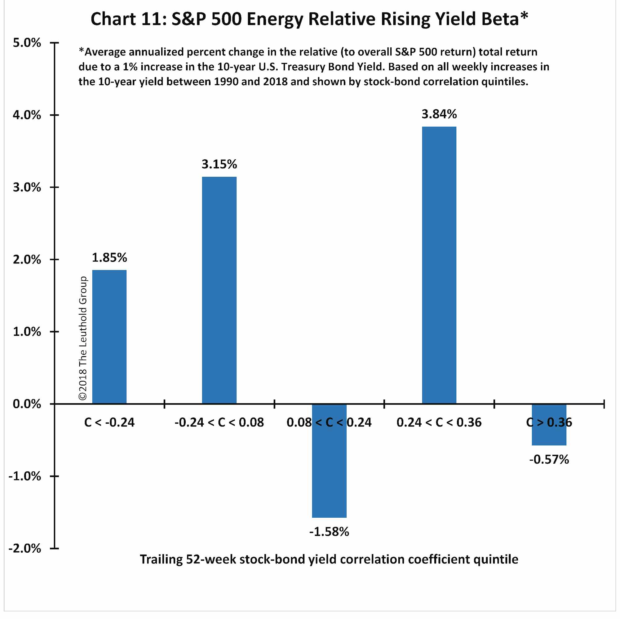Similar to Technology, both Industrials (Chart 9) and Materials (Chart 10) have positive rising yield betas across all correlation quintiles. Energy (Chart 11) tends to have a more varied relationship to rising yields. However, all three industrial/commodity sectors tend to do well when yields rise in the lowest two quintiles of the stock-bond yield correlation. Not surprisingly, these inflation-sensitive sectors perform well in the face of rising yields when Wall Street’s obsession is inflation.