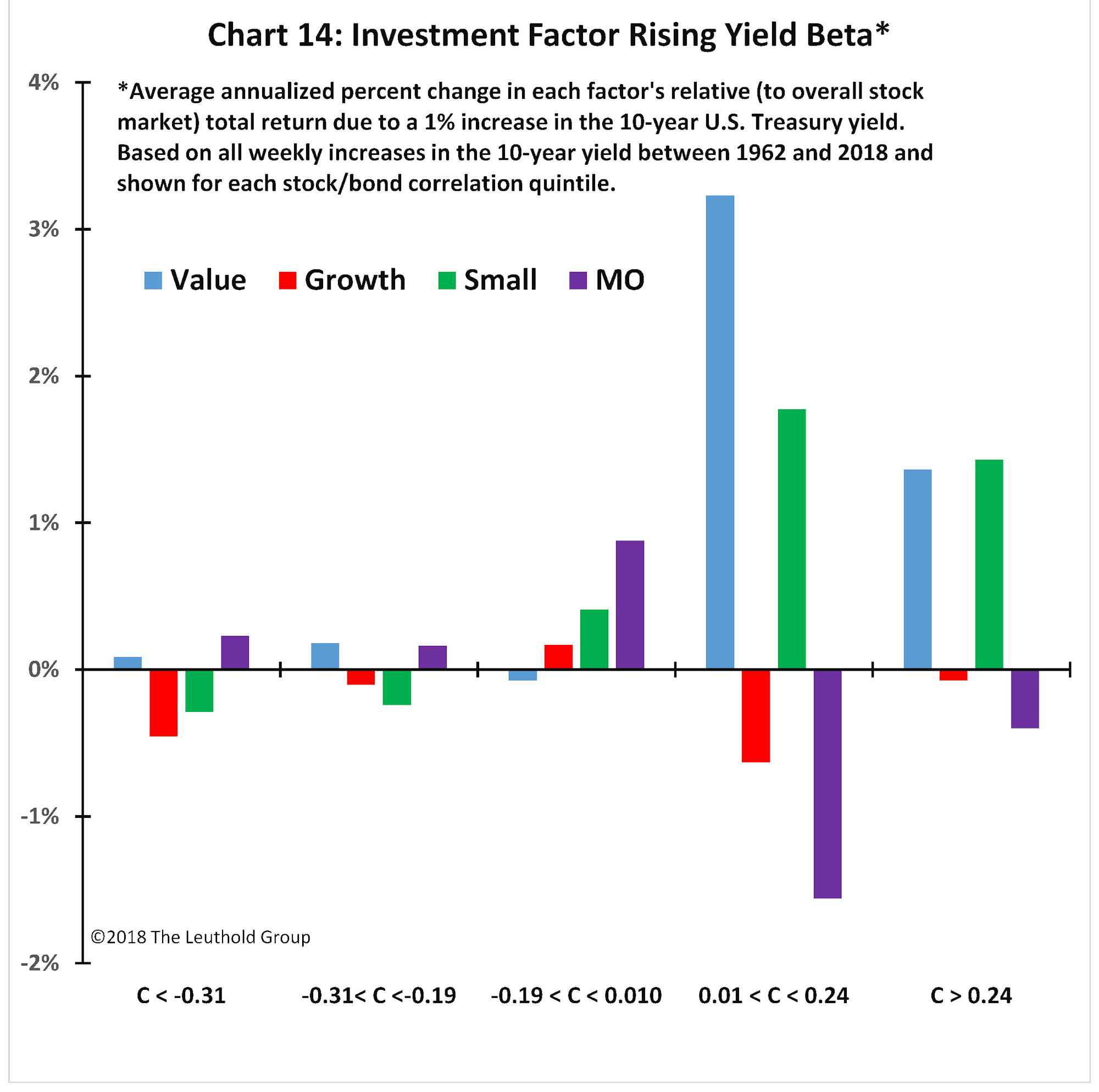 Chart 14 shows the yield sensitivities of investment factors are also impacted by the mindset on Wall Street. It illustrates the rising yield beta sensitivity across the five quintiles of the stock-bond yield correlation since 1962 for value, growth, small-cap, and momentum investing.