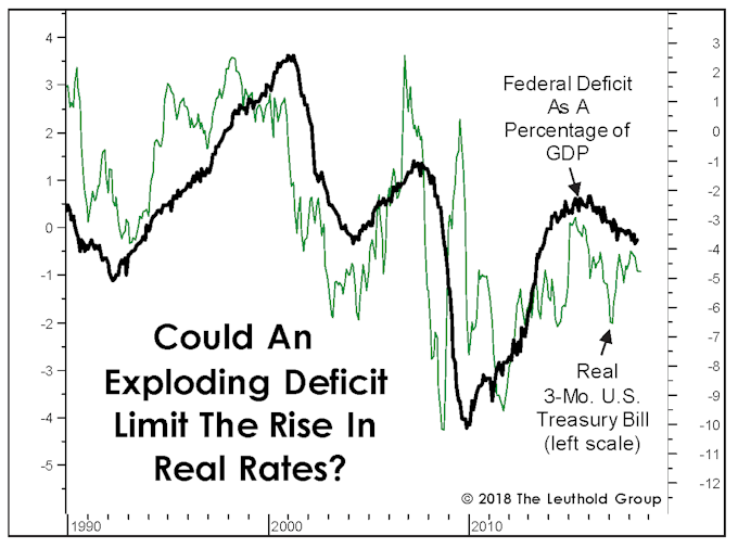 There’s a strong historical relationship between real short-term rates and the federal budget balance as a percentage of GDP. Large budget shortfalls like the current one are usually accompanied by negative real rates.